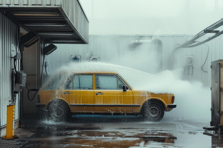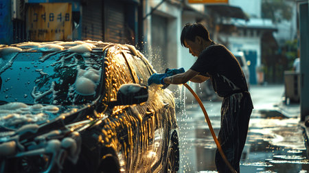 Generative AI, car wash with foam soap, high pressure vehicle washer machine sprays foam, self service