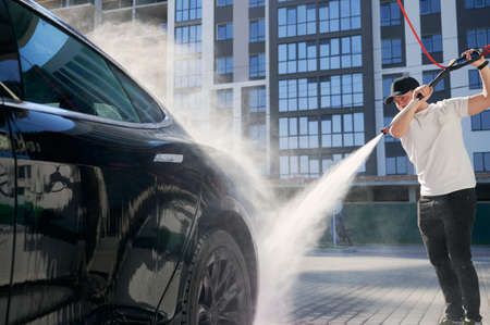 Male driver in white shirt using high pressure water sprayer while washing modern electric car on the street. Young man cleaning his vehicle at self-service car washing station.