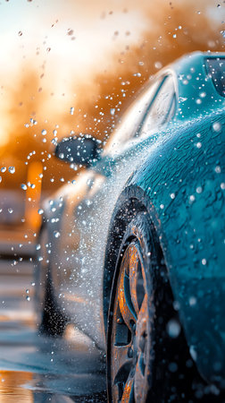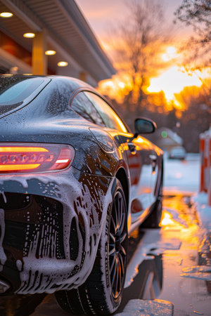 A detailed view of a car's front end, with foamy soap suds cascading over the headlight. The warm glow of sunset illuminates the scene, creating a dramatic and inviting atmosphere.