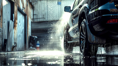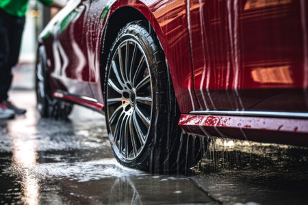 car wash, car wheel in soapy water generative ai.