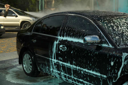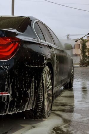 self-service car wash, self-service car wash, black car is washed with foam and waterblack car is washed with foam and water