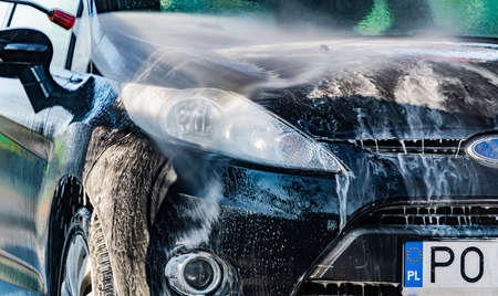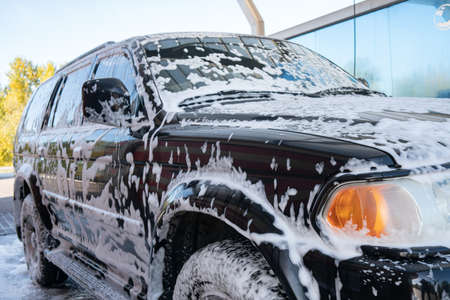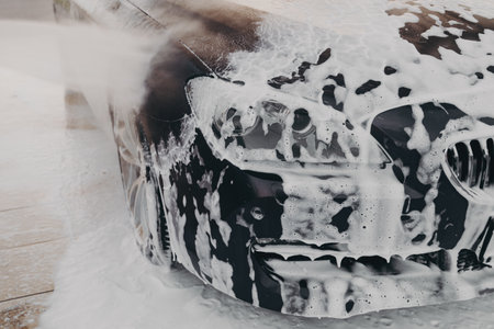 Professional car wash with high pressure washer and cleansing foam outdoors, close up of vehicle exterior surface in white soap suds getting wash at washing center