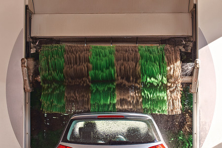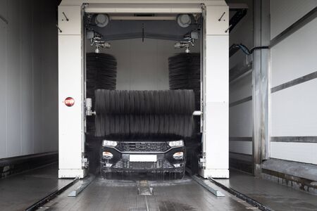 Cleaning Modern Vehicle Inside Automatic Brush Car Wash. Automotive Industry.