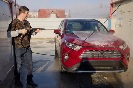 A man is washing a car at self service car wash. High pressure vehicle washer machine clean with water. Car wash equipment. Mlada Boleslav, 10.12.2019