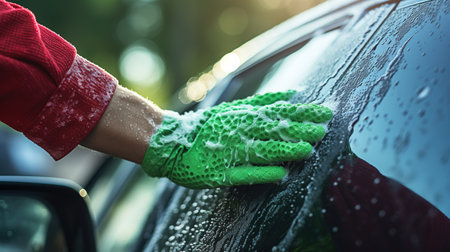 Man wash car using shampoo - every day life car care concept