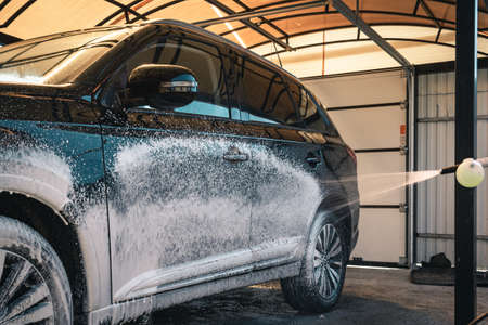 car wash with water and foam cleaning. auto, service vehicle industry wash auto, service