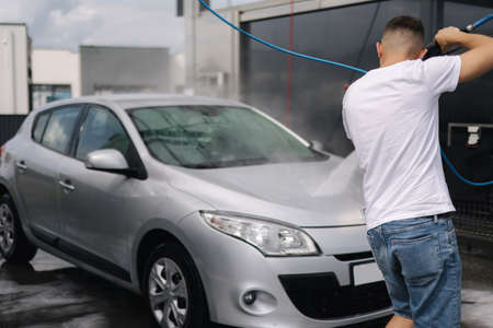 Young man washing his car in car wash. Cleaning Car Using High Pressure Water. Washing with soap.