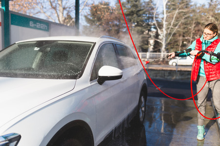 Woman holds high pressure water gun, car wash