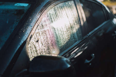 Car covered with water droplets under the sun's rays.