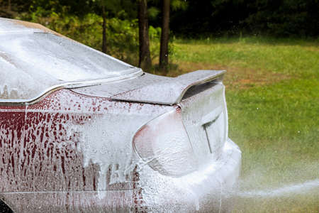 washing car with foam in summer