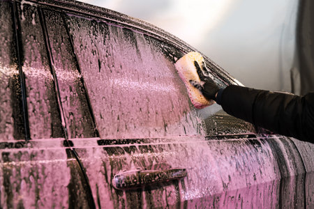 Cleaning the vehicle side window using a sponge and pink foam detergent during a manual vehicle washing at a self-service car wash