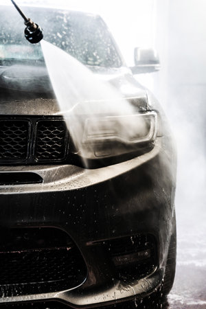 Car washing with high pressure water in a car wash. Car wash concept.