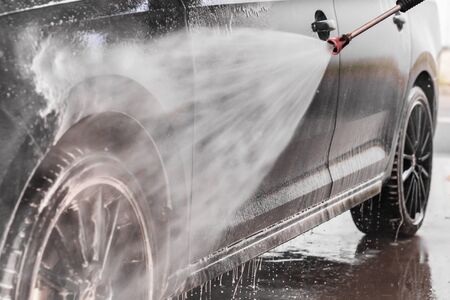 Car washing. Cleaning car using high pressure water. Contactless self-service car wash. Concept disinfection and antiseptic cleaning of the vehicle.