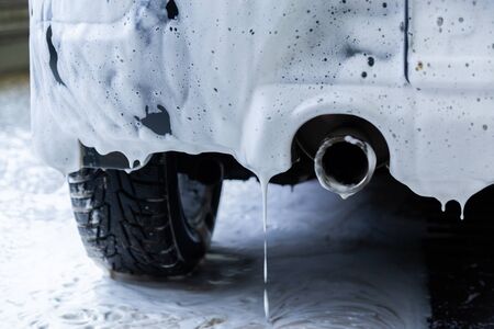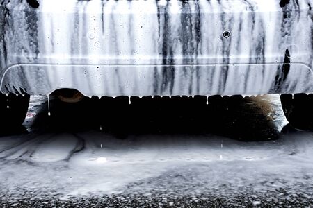 Fuel car covered by soap foam while washing indoors - close-up low angle view from back with selective focus