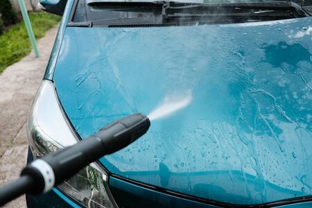 Car wash at home alone. Car wash high pressure close-up. A man washes a green car.
