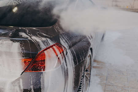 Close up of black car surface in white snow foam during carwashing and cleaning outdoors at self-service station or detail center, spraying detergent on vehicle with high-pressure washer