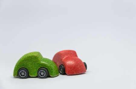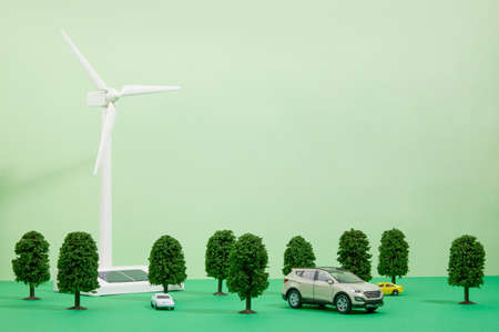 A toy green car rides over the background with an exhaust from birch leaves. The concept of reducing CO2 emissions from vehicles.