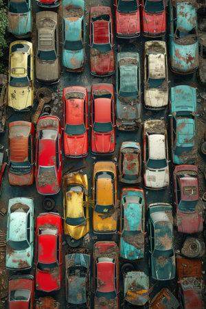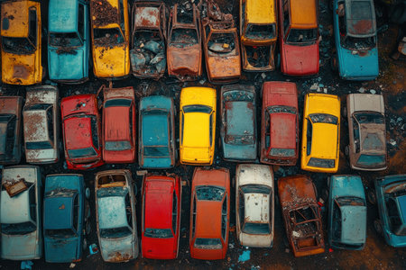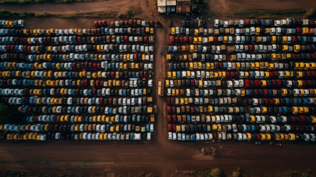 aerial view of stacked aged vehicles in junkyard, created with generative ai