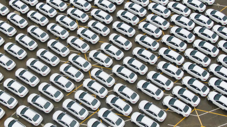 Aerial shot of parked cars in a structured row parking lease cars new production industry