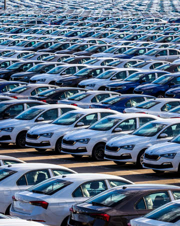 Russia, Kaluga - NOVEMBER 12, 2020: Rows of new cars parked in a factory or dealership parking lot on a sunny day.