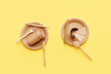 Two sets disposable biodegradable tableware of craft paper and wood - plates, forks, spoons, glasses on yellow background. Zero Waste. View from the top.