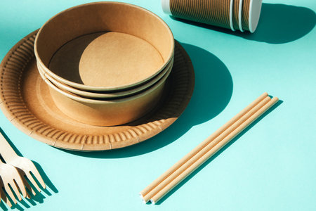 disposable paper and wood biodegradable tableware on a blue background, eco friendly lifestyle concept
