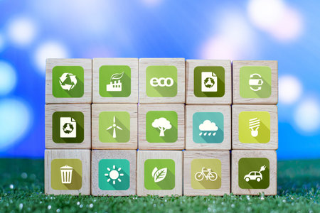 A close-up view displays a symbol composed of green wooden blocks featuring environmental icons. The blocks rest on a wooden surface with a soft-focus background of green foliage. The scene is illuminated by natural light. Suitable for illustrating eco-friendly concepts, this image may be used for marketing purposes.