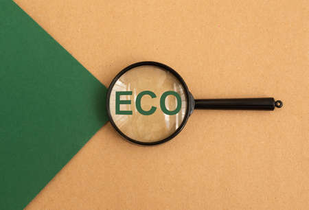 ECO word through magnifying glass on green and brown paper, top view. Concept of ecology study.