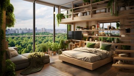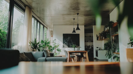 A bright and spacious loft filled with natural light, featuring cozy furniture and lush indoor plants, creating a serene and inviting urban living environment.