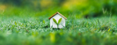 green home and eco-friendly construction conceptual image, house icon on green grass lawn under the sun with two leaves on top