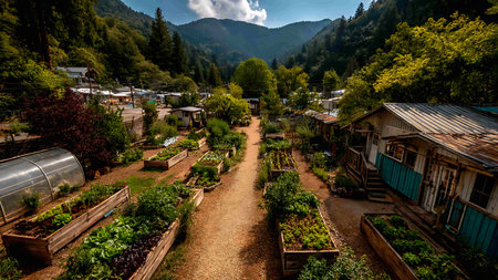 Eco-friendly tiny home community with solar panels and lush gardens.