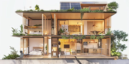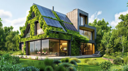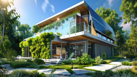 Eco-friendly house with solar panels, green walls, and a minimalist rectangular shape
