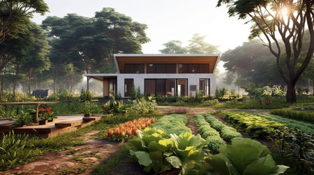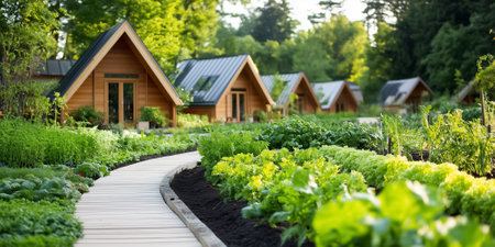 Pathway winds through vibrant garden filled with fresh vegetables. Modern wooden cabins stand amidst greenery, creating peaceful retreat. Concept of nature, eco-tourism, gardening.