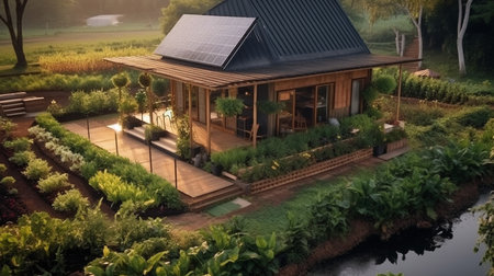 sustainable house with solar panels and vegetable garden on the roof, created with generative ai