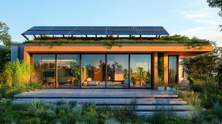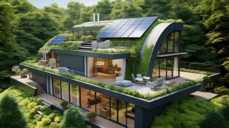 a modern eco-friendly home with a green roof and solar panels