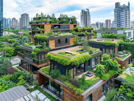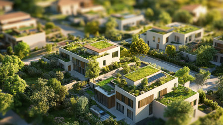 A stunning aerial view of modern sustainable homes featuring green roofs and lush gardens, blending architecture with nature in a vibrant urban landscape.