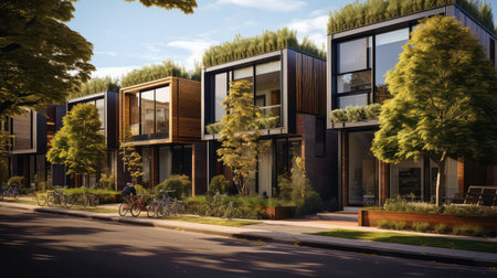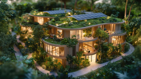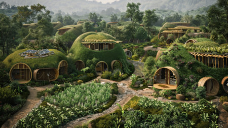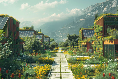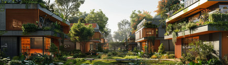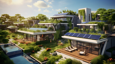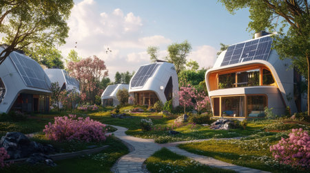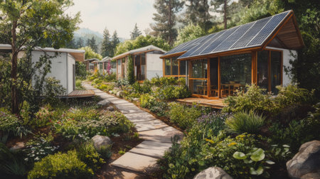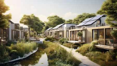 Nestled in a serene landscape, this eco-friendly neighborhood showcases modern homes equipped with solar roofs, rainwater systems, and blooming gardens, perfect for sustainable living.