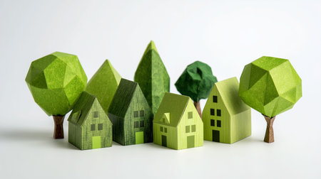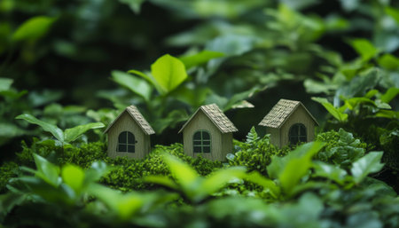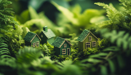 Serene landscape with miniature green houses amid lush foliage for eco friendly themes and designs