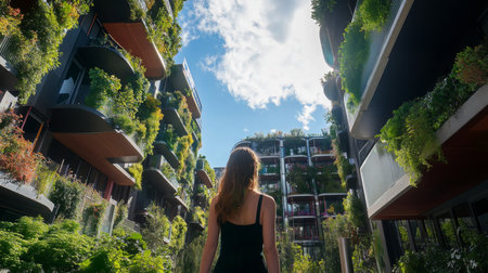 Architectural detail of an eco-friendly residential building with balconies lush with integrated greenery and sustainable design. AIG41