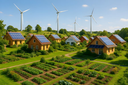 Eco-Village with Solar Homes, Wind Turbines, and Community Gardens