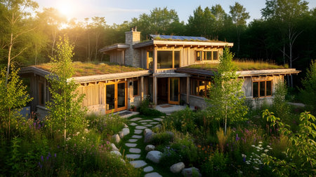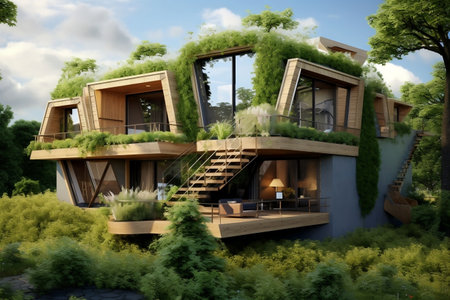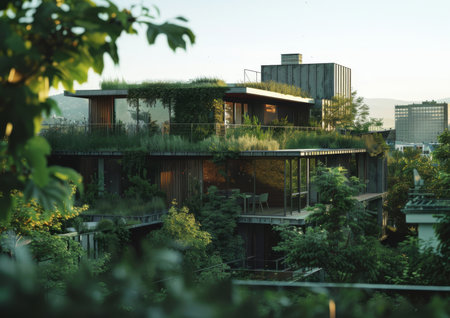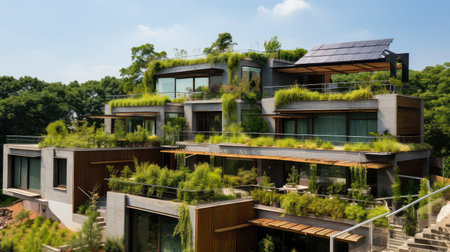 A residential building with green eco-roof covered in vegetation, promoting energy efficiency
