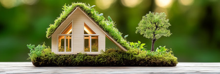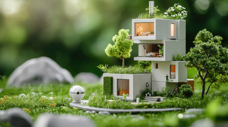 A modern, eco-friendly miniature house surrounded by lush greenery and stones, showcasing sustainable design elements and harmony with nature.