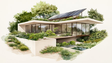 Modern eco-friendly house with solar panels and lush greenery, blending architecture and nature for sustainable living.