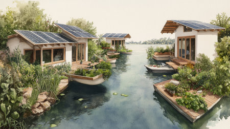 Sustainable floating homes with solar panels in a serene lake environment.