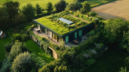 Aerial view of a modern eco-friendly house featuring a lush green roof and surrounded by vibrant foliage, emphasizing sustainable living in harmony with nature.