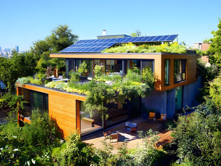 An image depicting a modern, eco-friendly home, equipped with green technologies like rainwater harvesting and solar panels, promoting sustainable living practices.