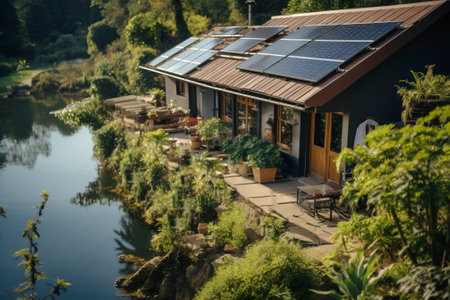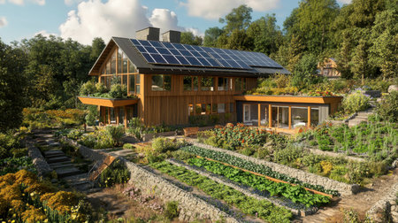 A stunning solar-powered home set amidst a vibrant garden, showcasing modern architecture and sustainable design. Lush greenery creates a serene outdoor retreat.