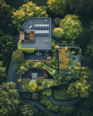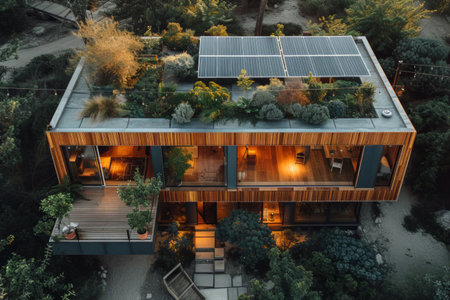 Aerial view of a modern house featuring a vibrant garden, solar panels, and lush plants, emphasizing sustainable living in a serene environment.