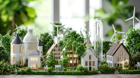 This captivating image showcases a miniature eco-friendly village featuring lush greenery and renewable energy elements, ideal for sustainability concepts.