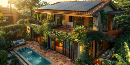 A stunning eco-friendly home with solar panels, surrounded by vibrant greenery and a pool